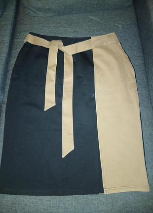 Юбка новая черного цвета с бежевой вставкой и вшитым поясом. Ткань имеет чуточку растяжимость, за счет этого красиво облегает фигуру. Длина 66см. Размер 50-52.