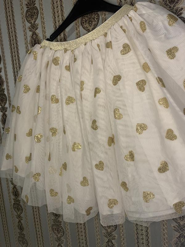 Біла фатинова спідниця з принтом в золоті сердечка і ма золотистий блискучий пасок. Два шари фатину, підкладка. Пояс-28,5 см, довжина-38 см.