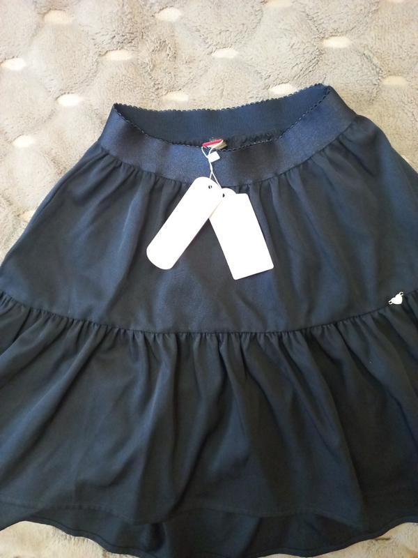 Нова спідниця на зріст 138 - 152. Темно-синьго кольору, перед коротший, низ довший. Склад 60 % віскоза, 40% поліестер.