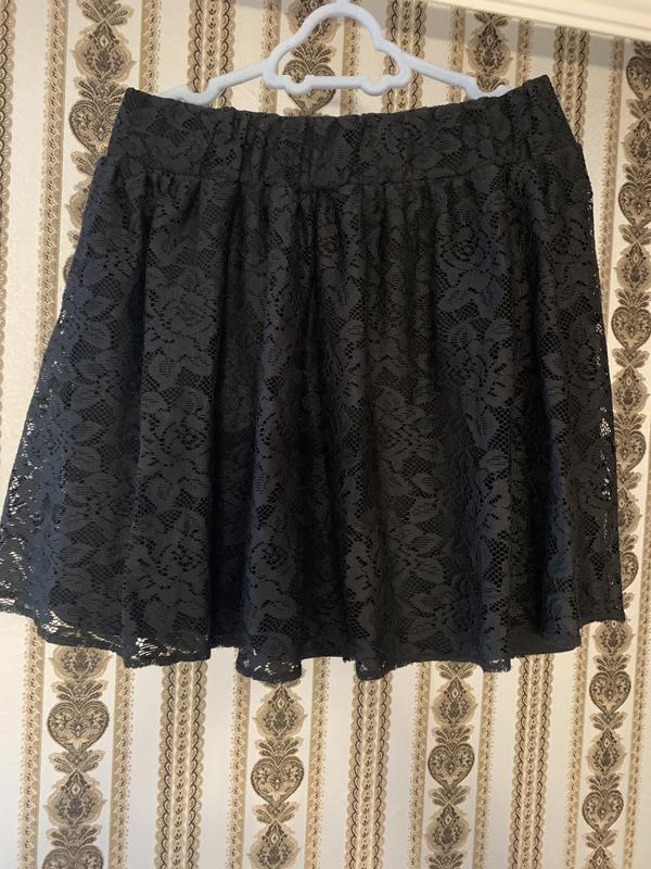 Чорна ажурна спідниця у відмінному стані. Пояс-широка гумка.Напівобхват талії 31см, довжина по бічному шву-39см.