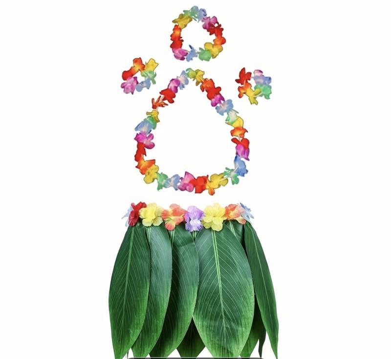 Крутий гавайський набір, новий. Прийшов пізно, тому на свято не встиг. По розміру думаю приблизно можна від 128 до 140. Можна і менше, спідничку треба затягнути, на худеньких