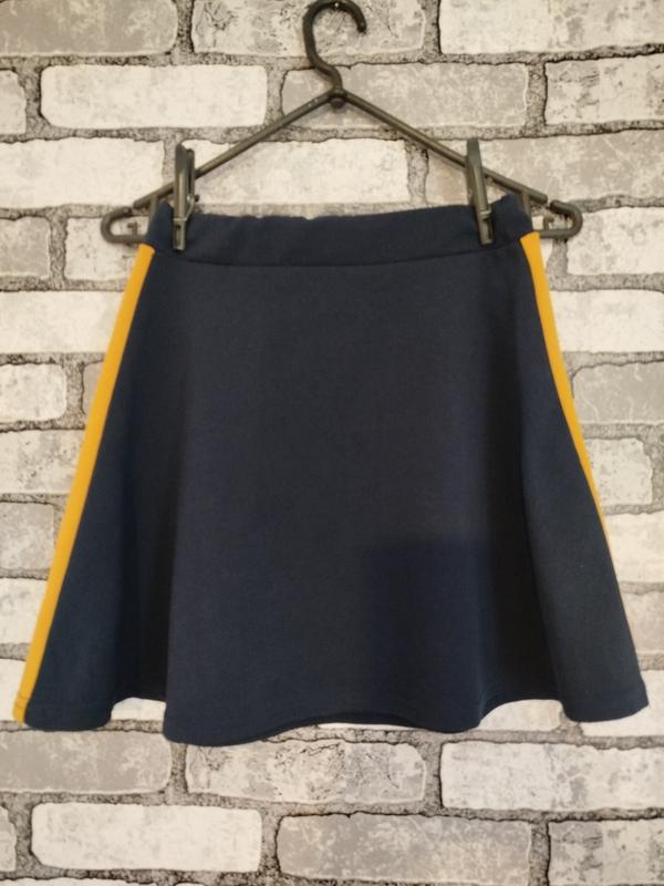 Классная юбочка на девочку 11-14 рочков. Цвет темно синий, желтые лампасы по бокам. Пояс на резиночці.Стан супер. Пояс (в спокойном состоянии) 32 см, тянется Длина 40 см Бедра свободно