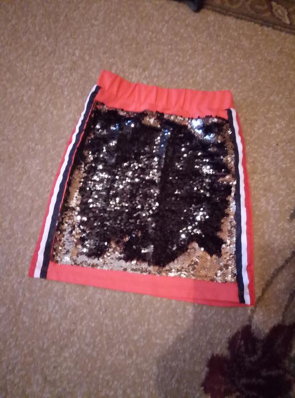 Модная юбка с лампасами и паетками-перевёртышами.Почти в новом состоянии.Длина-39см,ширина-27см.На худенькую девочку.Цвет-коралловый.
