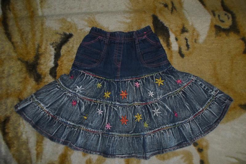 Джинсовая юбка на резинке с вышитыми цветами. ПОТ 23 см, ПОБ 38 см, длина 45 см.