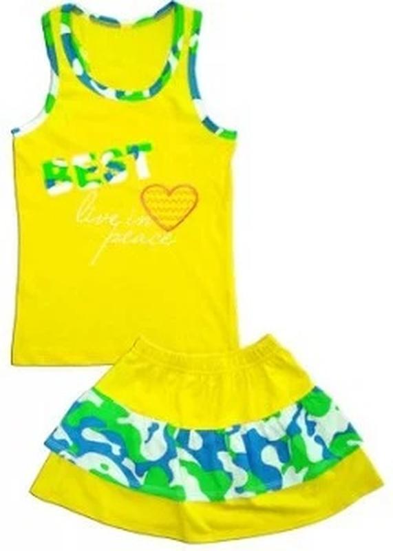 Летний костюм для девочки, состоит из двух предметов. Спортивная майка-борцовка из натурального полотна. Красивая юбка с двумя оборками, верхняя оборка из принтованого полотна. Цвет: Желтый; Полотно: Кулир; Состав: 100% хлопок; Оформление: Вышивка; В наличии рост: 128, 134