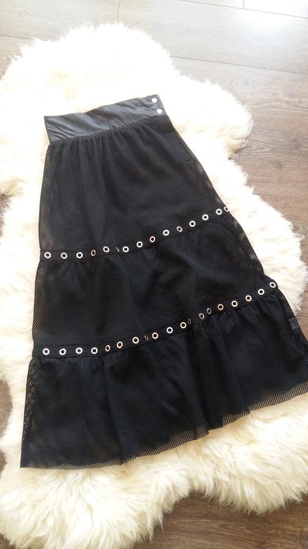 Эффектная юбка-макси из плотной эластичной сетки двойного плетения. Декорирована двумя лентами с тонкими металическими заклепками. Талия на широком поясе из эко-кожи с двумя кнопками. Низ юбки необработанный. Вещь высококачественная, стильная и незаурядная. Под низ надо одевать или юбку, или шортики, или лосины - вариантов много. Новая, сток, без бумажной этикетки. Размер по бирке 34 (на рост примерно 122-134, если по обхвату талии подходит, то можно и на рост до 158 см - длина позволяет): •длина - 84 см; •ПОТ - 30-30,5 см.