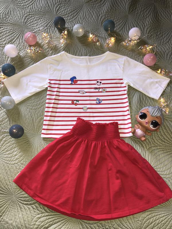 Классный костюм на любое время года! Реглан свободного кроя, рукав 3/4. Юбка на резинке, можно носить в заправленном виде и на выпуск. Качество супер! Размер 6-9
