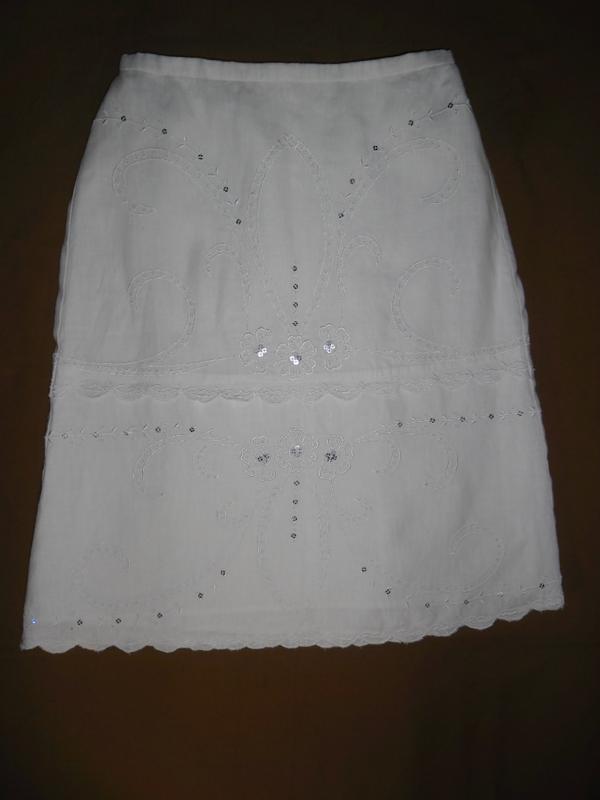 Спідниця міді ошатна 100% льон для дівчинки 13-16 років від Marks&Spencer. Фірмова,верх-100% білосніжний льон. Всередині спідниця на тонкій білій підкладці-100% бавовна. Прикрашена рішілье,машинною вишивкою і розшита паєтками. Дуже красива нарядна спідниця. Пояс ззаду на резике. Стан новий,без дефектів і слідів шкарпетки. Заміри: Пот-32,5 см,резика тягнеться до 41см. Побіди-46см. Ширина по низу спідниці-56см. Довжина спідниці по боковому шву-57,5 див.