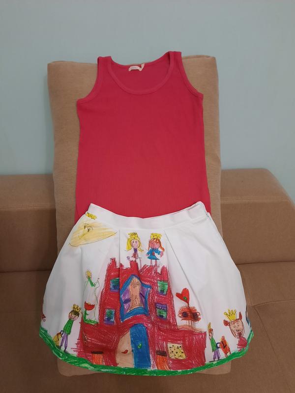 Продам прикольний комплект для дівчинки 8 років, оригінальна спідниця (на підкладці) + яскрава майка (колір фуксія). Купували новим. Заміри: спідниця - довжина 37 см, ширина в поясі 28 см; майка - довжина 48 см, ширина під руками 32 див. Є маленький нюанс на майці (злегка розпустилася нитка на сходинці, показала на фото), в іншому все ідеально. Комплект дуже оригінальний, другого такого не зустрінете.