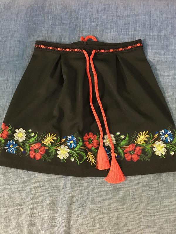 Юбка вышита на костюмной ткани, застегивается сзади на молнию, размеры на фото, машинная, вышивка