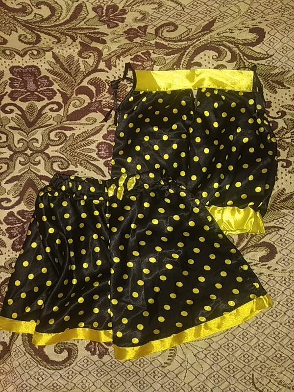 продам комплект на девочку новый,пошит с атласа(лежит пылиться)на возраст 4-6лет, один нюанс внизу юбочки лента немного вылезла из шва,замеры топа на брительках-длина переда от жёлтой вставки-30,5 по боку(от проймы)-22,5см,по спинке резинка,длина спинки от нее-27,5см ширина между проймами-32,5,замеры юбки клеш- длина от пояса 30см, ширина внизу-76,5(юбка сложена вдвое)ширина пояса-22см(тянется до 31)