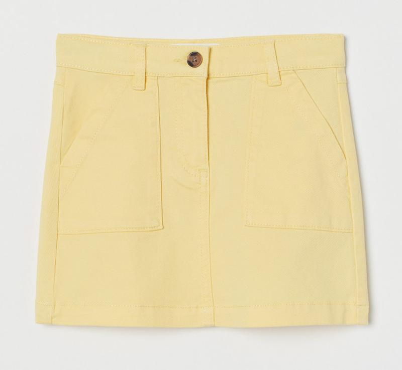 Юбка из плотной хлопковой ткани желтого цвета фирмы Н&М. Юбка с резинкой на талии, и внутренней резинкой для регулировки ширины. Застегивается на молнию и пуговицу, боковые карманы. Отлично будет сочетаться с футболками и маечками. Состав: Хлопок 98%, эластан 2% Размер: 5-6 лет на рост 116см ПИТ - 28см, длина юбки от пояса - 30см