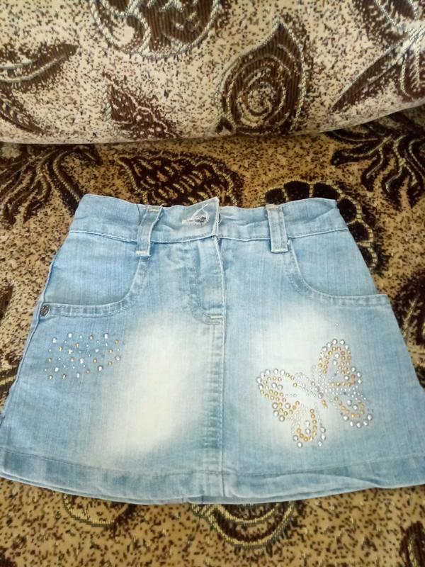 Джинсовая юбочка для Вашей красотки. Качественный светлый джинс, украшена стразиками. Сзади 2 кармашка. Очень красиво смотрится. Подойдёт от 3 до 5 лет.