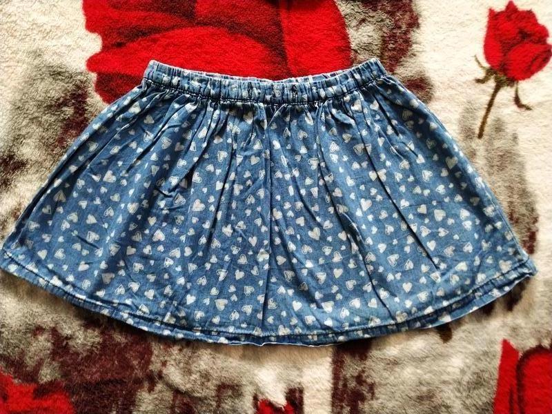 Джинсова спідниця в сердечка для дівчинки 4-5 років в ідеальному стані. Довжина-28 см,пояс-25 див.