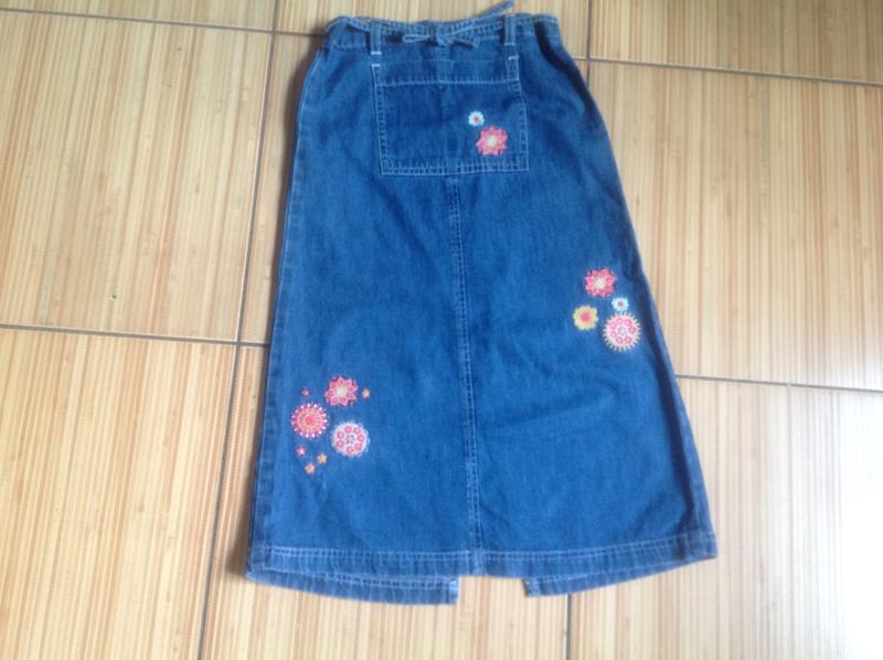 Юбка длинная джинсовая на девочку.Декорирована вышивкой.На талии впереди тонкий поясок,сзади резинка.ПОТ 28 см,ПОБ 36.5 см,длина изделия 58.5 см.Смотрите мои другие объявления.