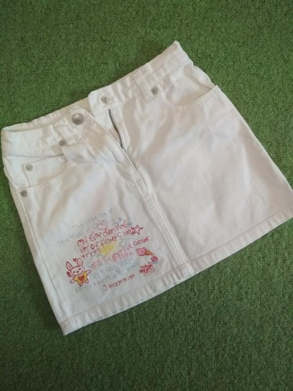 Спідничка для дівчинки у відмінному стані від "H&M". Малюнок - нашивка нитками. На поясі ззаду резиночка. На ріст 116. На 5-6років. Заміри: В поясі: 26-28см Довжина: 29см