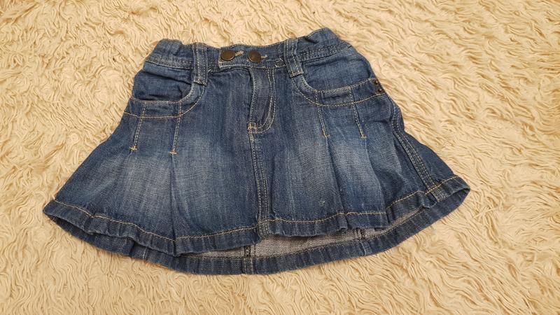 Юбка джинсовая со сборками, карманами, застежка змейка и 2е кнопки, в поясе резинка с регулировкой по объёму.Ширина 25 см, длинна 23 см.