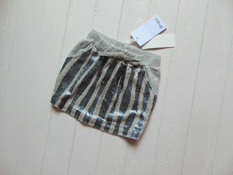 Новая стильная юбка для девочки. Внутри двунить. Декорирована пайетками. Боковые и задние карманы. Пояс на резинке, тянется, регулируется шнурочками. Мягкий и приятный к телу материал, тянется. Шикарное качество. Gaialuna. Размер 26, идёт на 4 года, рост 99-104 см. Состояние: новая, с биркой. Состав: 84% хлопок, 16% полиэстер. Замеры: длина 25 см, талия 22Х2 см, тянется до 38Х2 см, регулируется шнурочками, бёдра 33Х2 см, ширина юбки внизу 37 см. Материал тянется. Цена 220 грн.
