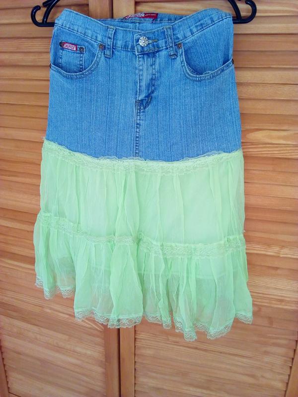 Оборка на юбке шифон.Отделка кружево.Верх —джинс.Пояс —33см.Бёдра—46см.Длинна—63см.Джинс тянется.