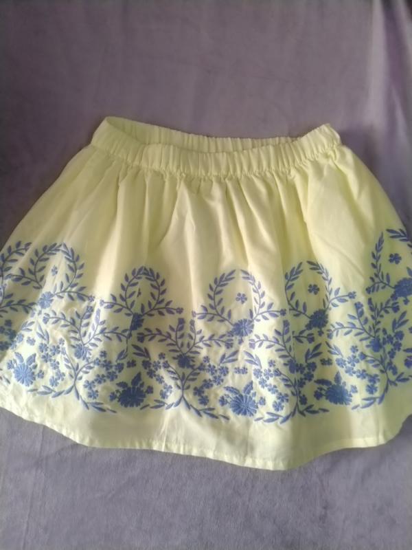 Бавовняна спідничка, рр.122-128, 134-140, 146-152 лимонного кольору з блакитною вишивкою. Бірки обрізані.