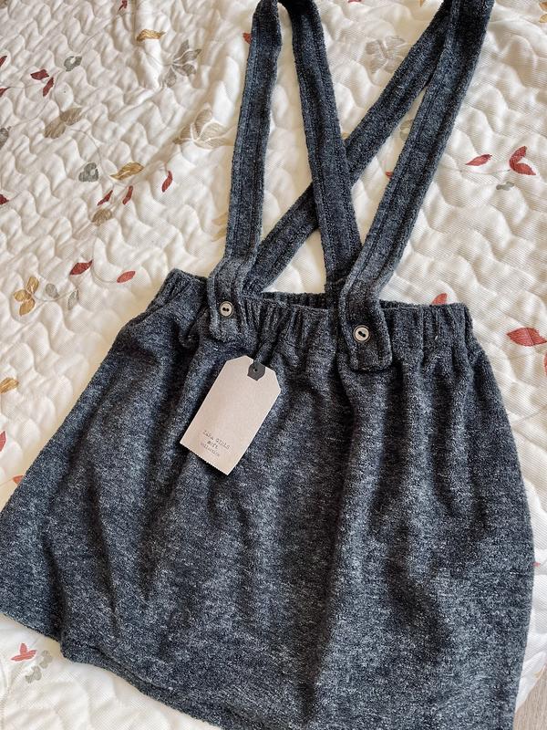 Спідниця з бретелями. Матеріал нагадує махровку, зараз в тренді. З блузами, гольфами дуже стильно буде поєднуватись. Від пояса довжина 33 см. В поясі резинка. Висота бретель 34 см