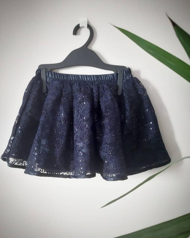 Неймовірно красива спідничка- просто необхідна річ для будь якої маленької модниці. Бренд OVS. Верх- тканина гіпюр з паєтками,низ - атласна підкладка. Колір темно синій. Розмір 98. Довжина 27 см, ширина в поясі 24 см( пояс на резинці)