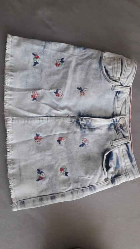 Юбка джинс для девочки с принтом цветочек, цвет светло голубой.Сзади два кармана и впереди.Застёжка пуговица и молния. Размер 8-9 лет 134 см.
