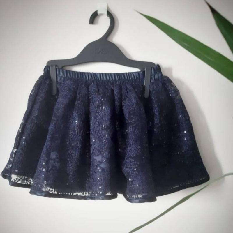 Неймовірно красива спідничка- просто необхідна річ для будь якої маленької модниці. Бренд OVS. Верх- тканина гіпюр з паєтками,низ - атласна підкладка. Колір темно синій. Розмір 98. Довжина 27 см, ширина в поясі 24 см( пояс на резинці)
