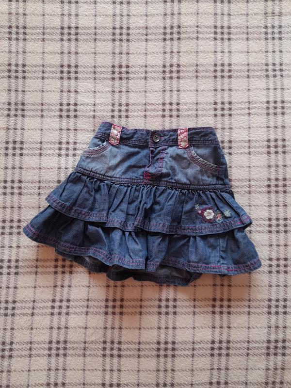 Джинсова спідниця з вишивкою, на резинці. Також може бути з поясом. Застібається на ґудзику, є дві кишені.