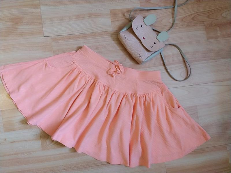 Фірмова спідничка на вік 4-5 років. Купила, та так ніразу не одягли. Бірка зірвана. Моделька сонцекльош, колір персиковий, трішки темніший ніж на фото. Довжина 28 см. Пояс 26 см. і трохи тянеться. Обміну і повернення немає,задавайте питання всім відповім. Оплата на картку Приватбанку. Доставка УП.НП оплата при отриманні.