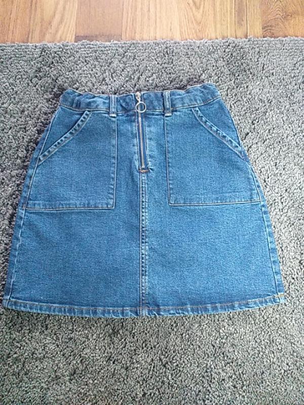 Джинсова юбка на 11-12 років є утяжки купували за 1080 пуговкі біля застьожки не було зразу, можна прикріпити самим.Є маленький дефект здерлась трішки застіпка на фото показано,в носінні не видно.