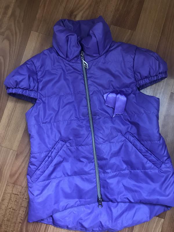 Стилтна жилетка фіолетового кольору для дівчинки 4-6 років, білок нема. Довжина ззаді по спинці - 46 см, 37 см по блискавці. Плечі - 27 см, ПОГ - 34 см.