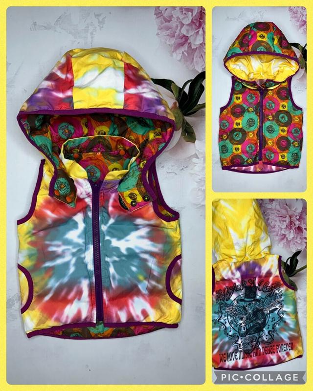 двухсторонняя жилетка с наполнителем. (Пух) капюшон отстёгивается бирки нет, смотрите замеры длина 43. ПОГ 37.