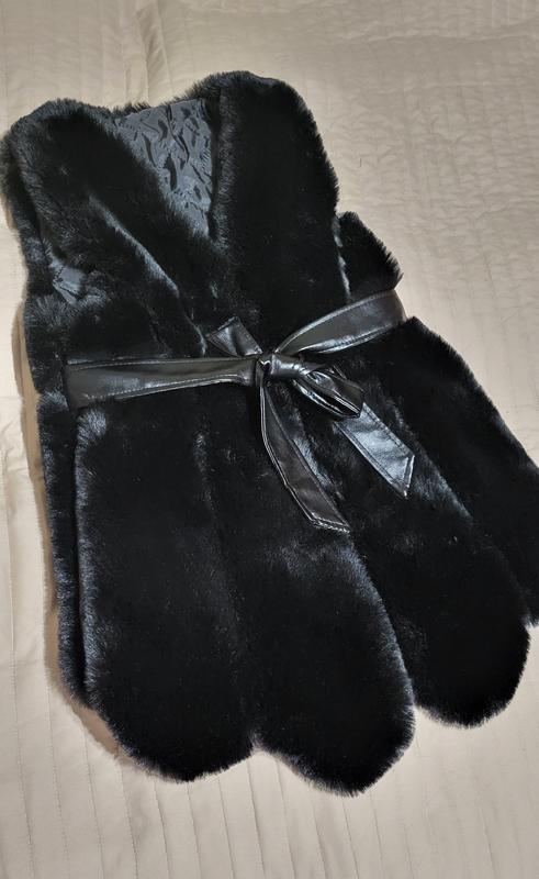Модная жилетка из искусственного меха, подойдет на размер 134 - 146, в идеальном состоянии, без дефектов, длина по спинке 55 см. Модель выполнена из искусственного меха и дополнительно декорирована поясом из эко кожи. Застегивается с помощью крючков, которые не видны по пушистому ворсу изделия.