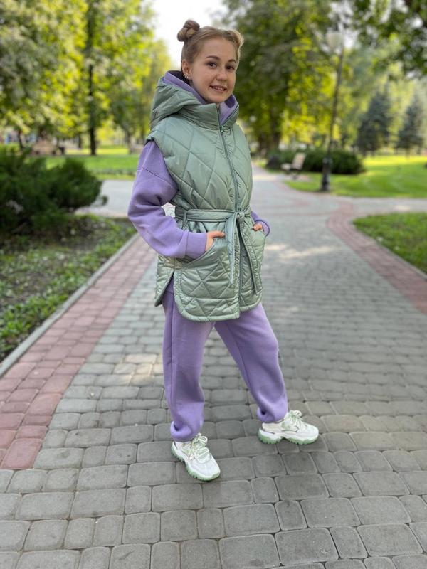 Подростковая жилетка рост: 146 152 158 164 Цвет: сирень, пудра, черный, сливка Материал: Плащевая ткань «Richard» Подкладка: Memory oil Наполнитель: Синтепух плотностью 100г/м2 Подростковая демисезонная жилетка, модель из стеганого текстиля. Легкий утеплитель из синтепуха обеспечит защиту от ветра и холода. Капюшон регулируется, съемный (на молнии). На талии регулирующий пояс, по бокам накладные карманы. Застежка на молнию с ветрозащитной планкой изнутри.