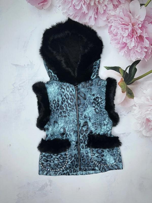 Жилетка с отделкой из натурального меха кролика. Шили под заказ, таких больше нет. Состояние жилетки новое, почти не носили. Впереди 2 кармана, украшенные кристаллами Сваровски Ткань внутри на коротком меху, тепленькая. Состояние новой Смотрите замеры Длина 41. ПОГ 33-37