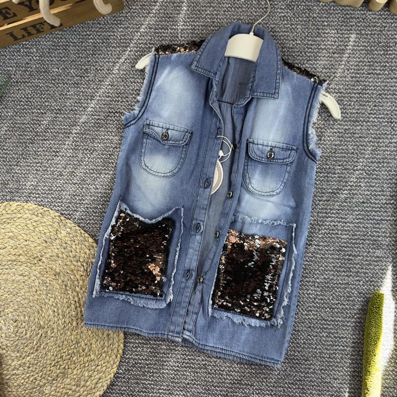Мега стильна джинсова жилетка на ґудзиках відмінної якості! Виробництва Туреччина! Прикрашена двосторонніми пайєтками! Розміри: 3р – довжина 47, півобхват 31