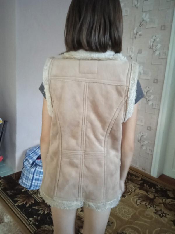 Жилетка для девочки на рост 152-158 см, на меху. Длина 56 см, ОГ 39 см полуобхват, два маленьких кармана, застежки металлические (крючки). Не повреждена, пятен нет.