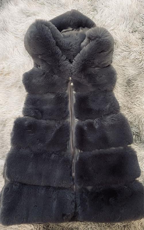 Жилетка з хутром кролика( стриженого) в індивідуальному стані, розмір вказано 158. Вдягалася 2 рази, колір сірий