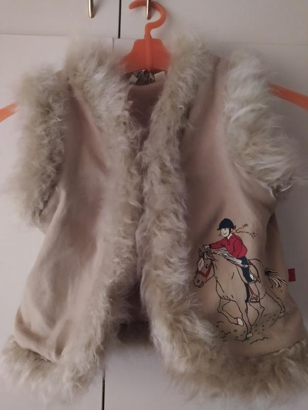 Теплый жилет на ребенка 2-3 г. Можно и на 4. Ткань тонкая, типа искусственной замши. Внутри толстый флис Жилет оторочен искусственным мехом.