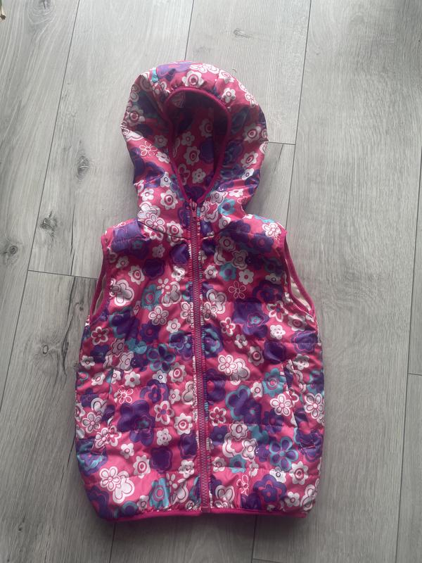 На девочку 3-5 лет, легкая, качественная, с подкладкой, яркие цвета, тоненькая резиночка по краям изделия, карманы. Без дефектов