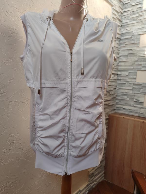 Жилетка на молнии,с кармашками.вставки из сетки,с капюшоном.Удобная,на лето Супер.Длина 54см,по груди 48см