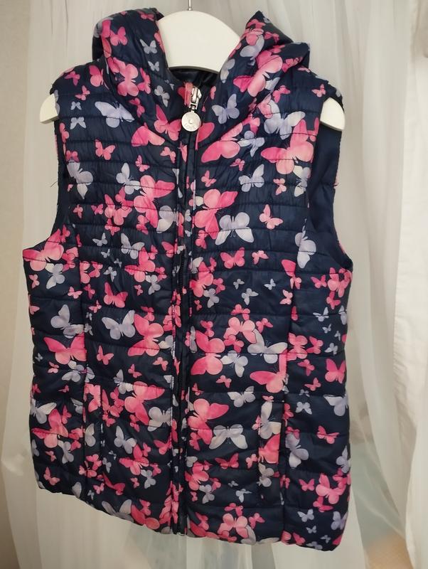 Жилетка на девочку 5-6 лет, без дефектов. Есть капюшон и 2 кармана. Длина 41см, ширина 35см.