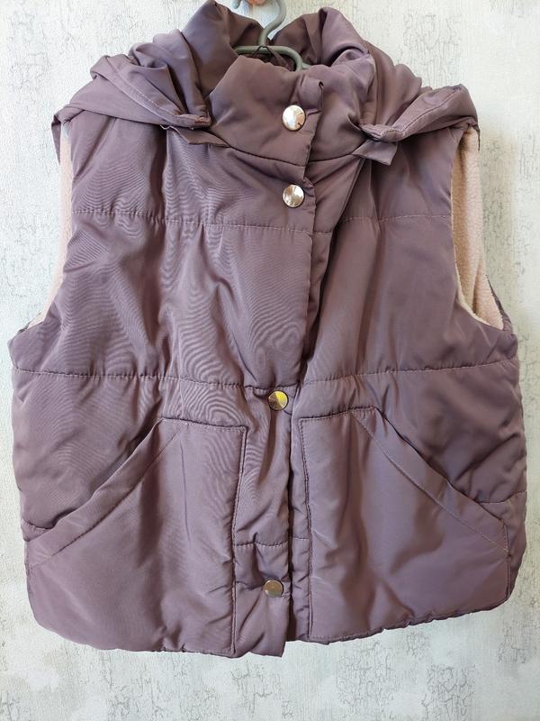 желетка на девочку, на рост 110см. в идеальном состоянии. на кнопках. капюшон также на кнопках. без дефектов