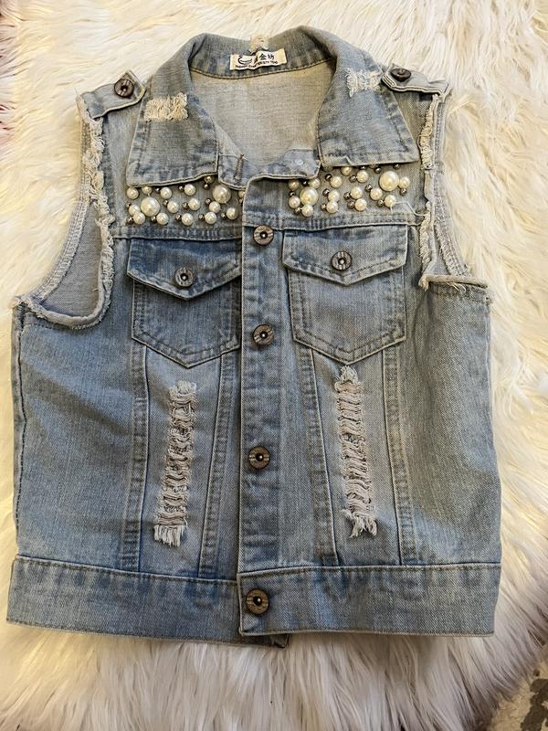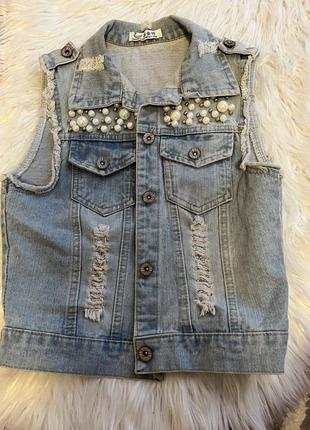 Жилетка джинсова прикрашена перлинками. Дополнение любого образа.