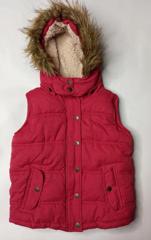 Очень теплая и яркая жилетка на девочку с капишоном fat face 4-5р