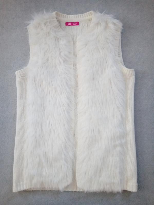 Замечательная стильная жилетка для девочки, б/в отличном состоянии. На рост 146 см ( возраст 10-11 лет). Замеры: длина 60 см, полуобхват груди 37 см.