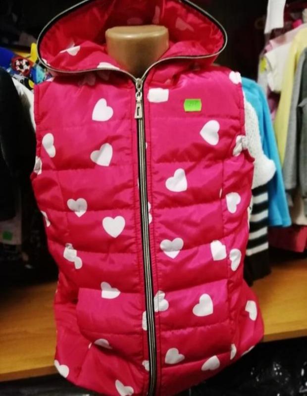 Жилетка на дівчинку 6-8 років ( дивитися по замірам) Яскраво-рожевий колір і білі серденька ))) Довжина 67 см, Напівобхват грудей 44 см, пройм 18,5 см, до низу розкльошена, Напівобхоп низу 49 см. Стан - ідеальний . Майже не носили
