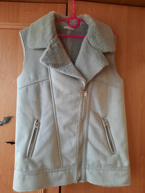 Очень красивая качественная тёплая жилетка на девочку Next. Маломерит, смотрите замеры: длина 58 см, ширина 42 см. Состояние новой. В подарок шапочка: высота 21 см, ширина 20 см.