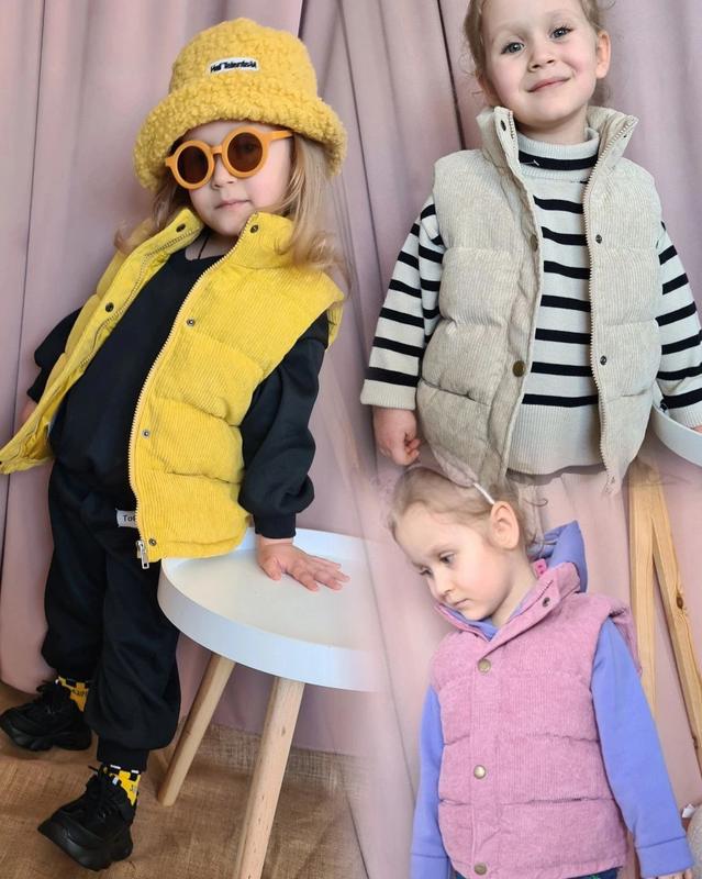 🔹 Стильна жилетка 🔹Имеет 2 кармашка, застежка молния + кнопки, высокая горловина. 🔹 Верх - вельвет, подклад нейлон, красивая прослейка утеплителя синтепона. 📏📐📝ЗАМІРИ📝📐📏 Маломерные, ориентир на замеры, дополнительно укажу в скобках на который примерно рост. 100 (86-92) длина 35, ширина 25, плечи 25 110 (92-98) длина 36, ширина 36, плечи 26 - серой нет 120 (98-104) длина 40, ширина 39, плечи 28 Цена 720 грн ▪️N-08